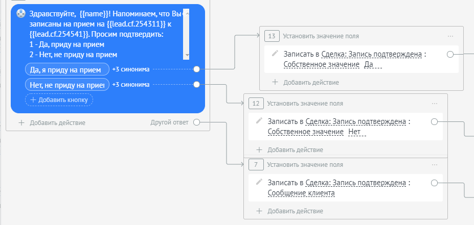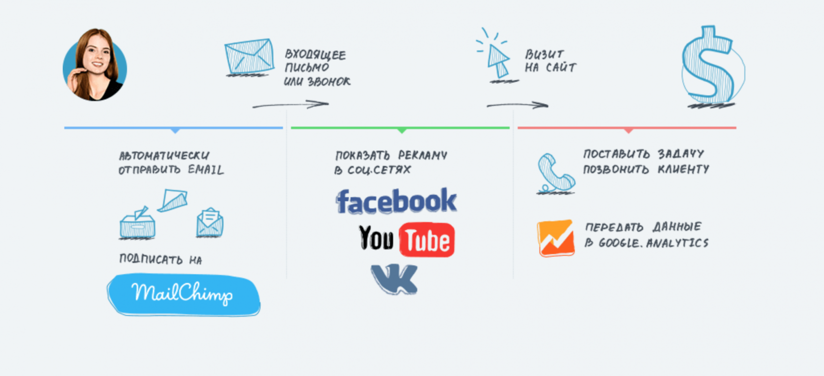 Воронки продаж умеют автоматически рассылать сообщения и письма клиентам, ставить напоминания менеджерам и присваивать сделкам теги (например, тег "неактивный клиент", если не было покупки/визита в течение определённого времени)