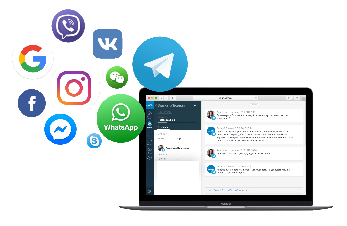 Интеграция с любыми соцсетями: все сообщения из Instagram, WhatsApp, VK и других каналов попадают в кабинет amoCRM. Возможно автоматическое создание сделок и/или задач по каждому сообщению
